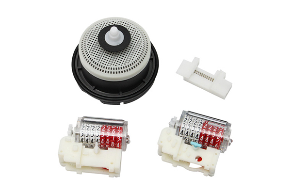 活塞式水表机芯由计数机构及计量机构组成,其中计数机构由插销、齿轮盒及计数器组成,而计量机构则由计量室、活塞转子、隔板、衬套、拨叉及盖板等几个部件组成。