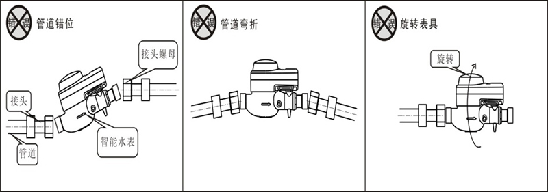 将表接头套入接头螺母后安装到管道上,然后扭转接头螺母将水表安装到管道上,保持水表读数度盘水平向上,水表与管道连接时不应受过大的折弯力,以免损坏水表接口断裂。禁止出现如下图所示的安装方式: